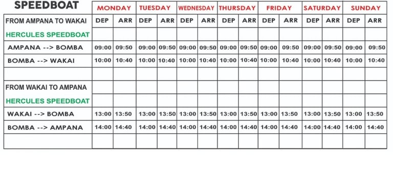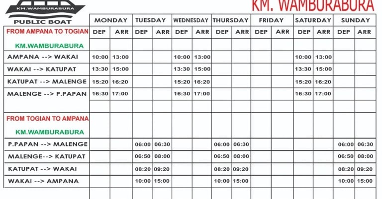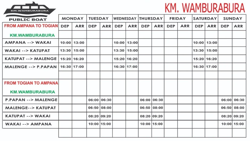 You can catch Public boat Wamburabura from Ampana to Wakai, Katupat and Malenge - Pulau papan every Monday, Wednesday and Saturday at 10:00 hrs